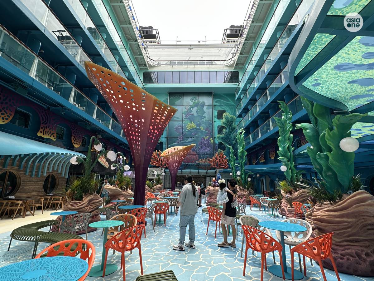 Located at the back of the ship, the open-air retreat features glass canopies that let sunlight stream in, creating a dreamy atmosphere. Coral reef-like structures add to the illusion of being under the sea.