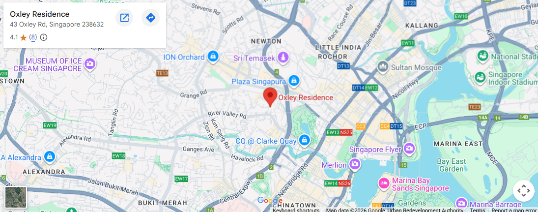 Located between Somerset MRT Station and Dhoby Ghaut MRT Station (both under a 10-minute walk), Oxley Residence sits in a highly central pocket close to Orchard Road while remaining within walking distance of lifestyle options along Killiney and River Valley Road.